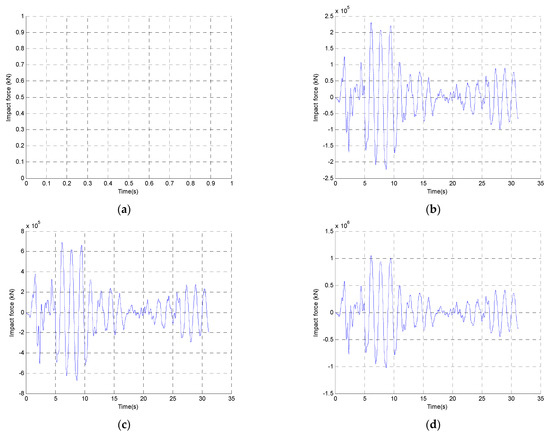 Impact force time histories obtained for each story: (a) base level; (b) first story; (c) second story; (d) third story.