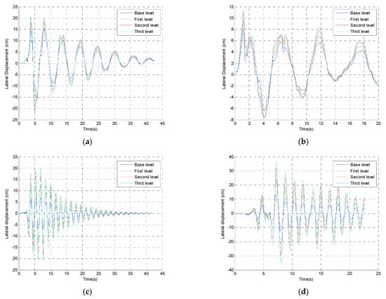 Lateral displacement time histories of each story in the non-isolated model of a building during seismic excitation: (a) Parkfield; (b) Kobe; (c) San Fernando; (d) Tabas.