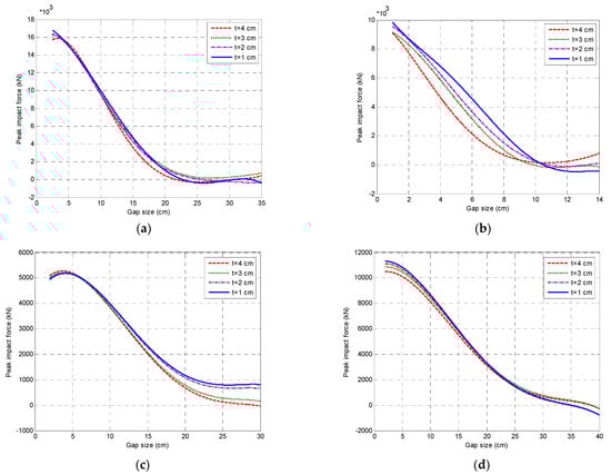 Peak values of impact force for different gap sizes and rubber bumper thicknesses under different seismic excitations: (a) Parkfield; (b) Kobe; (c) San Fernando; (d) Tabas.
