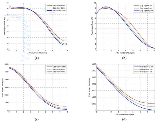 Peak values of impact force for different numbers of rubber bumpers and gap sizes under different seismic excitations: (a) Parkfield; (b) Kobe; (c) San Fernando; (d) Tabas.
