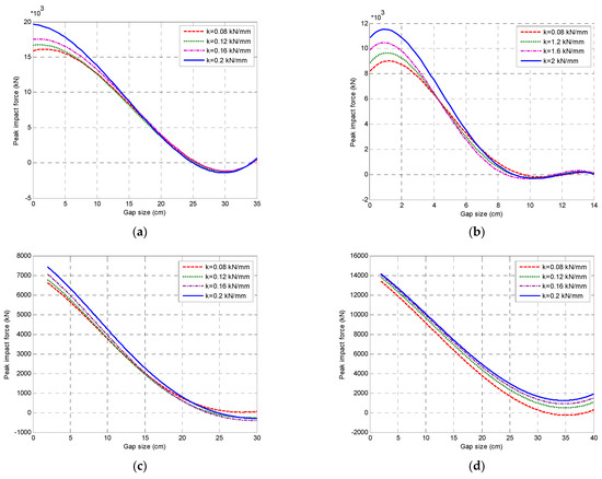 Finally, the effect of bumper stiffness was numerically evaluated using different values of stiffness (from 0.08 kN/mm to 2 kN/mm). The results of the analysis for different gap sizes are presented in Figure 14. As can be seen from the figure, increasing the bumper stiffness leads to a decrease in the peak impact forces. For instance, using a gap size of 5 cm, the peak impact forces for the Parkfield earthquake were equal to 15.2 × 103 kN, 15.55 × 103 kN, 16.75 × 103 kN and 17.65 × 103 kN for bumper stiffnesses of 0.08 kN/mm, 1.2 kN/mm, 1.6 kN/mm and 2 kN/mm. At the same time, the values of the peak impact forces for the Kobe earthquake were equal to 4.35 × 103 kN, 4.55 × 103 kN, 4.65 × 103 kN and 5.85 × 103 kN for the corresponding values of bumper stiffness. Considering a 20 cm gap size, the peak impact forces for the San Fernando earthquake were equal to 6.45 × 102 kN, 7.20 × 102 kN, 7.90 × 102 kN and 8.10 × 102 kN for bumper stiffnesses of 0.08 kN/mm, 1.2 kN/mm, 1.6 kN/mm and 2 kN/mm. At the same time, the values of the peak impact forces for the Tabas earthquake were equal to 3.98 × 103 kN, 4.65 × 103 kN, 4.98 × 103 kN and 5.05 × 103 kN for the corresponding values of bumper stiffness.