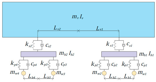 The train is represented by the two-dimensional (2D) 4-axle railway carriage model shown in Figure 1. The vehicle model includes lumped masses, rigid bars, springs, and dampers. There are 10 degrees of freedom (DOFs) in this vehicle model: vertical translation and rotation about the centre of gravity for the car body and bogies and vertical translation for each wheelset. The wheels are fixed to the track with no separation being permitted. This reduces the system to six DOFs. In this model, each wheel is modelled with a mass (). It is connected to the bogie by a primary suspension represented by a spring () and a viscous damper () in parallel. The bogies are represented as rigid bars with mass () and moment of inertia (), whereas the main body of the vehicle is also represented as a rigid bar with mass () and moment of inertia (). Springs (. ) and dampers () represent the secondary suspensions to connect the bogies to the main body. The distances between the car body centre of mass and the bogie pivots are and . Similarly, , ,, and are the distances between the bogie centres of mass and the wheels. Vehicle models of this type have been used in many studies [35,36].