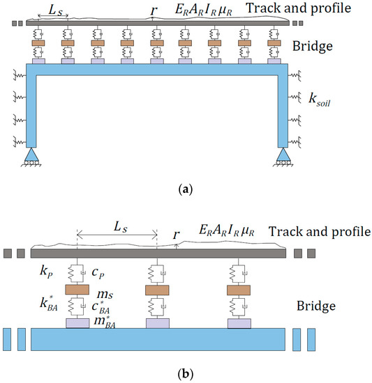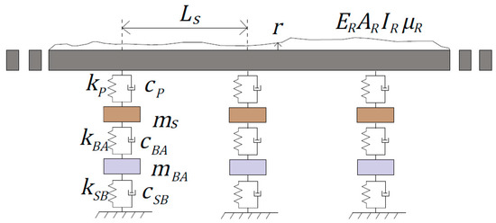 The track is modelled as a beam supported on spaced sprung mass systems (Figure 2) corresponding to the railway sleepers. The rail is modelled by beam elements in a finite element framework. In this three-layer sprung mass system, the masses represent the sleeper, and ballast, . The various layers are connected by spring and damping systems which represent pad, ballast and sub-ballast, with respective properties: and ; and ; and and . A surface profile is included on the track. Similar models have been used by other researchers [38,39].