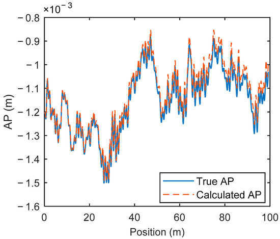 Here, a 100 m railway track with a profile and a 4-axle railway carriage model vehicle of known properties are used to generate the bogie vertical accelerations and angular velocities. The vehicle properties and speed are shown in Table 1. These signals are then taken as inputs and used to back calculate the AP using the Inverse Newmark-β method. The calculated results are compared with the original ‘true’ AP in Figure 4. The true AP is the AP used to generate the bogie vertical accelerations and angular velocities. The calculated result is from the first axle of this train. The calculated AP has similar local features to the ‘true’ AP but is displaced downwards by a ‘drift’ effect that results from an accumulation of numerical inaccuracies. As the drift effect is very low frequency, it has a negligible effect on the train/track dynamic interaction.