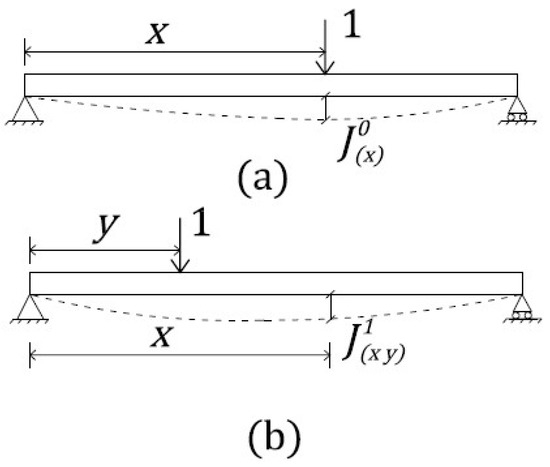 OBrien et al. [43] describe a ‘Matrix Method’ to determine the IL from a measured multi-wheel response. This method is very effective at finding the IL directly from strain measurements. In this section, a method is proposed to find the moving reference influence line (MR-IL) for deflection under the leading axle of the railway carriage. In conventional structural analysis, an influence line describes the response at a fixed point on a bridge. By its nature, MR-IL is more complex as the point of reference is no longer fixed and the load and response may be at different relative locations. The ‘general’ MR-IL function, J1(x, y), is defined here as the response at a moving point, x, to a unit load at any point, y—see Figure 5. A special case is when the load and the measurement are at the same point (x = y). This response at a moving point, x, to a unit load at that point, is referred to here as the ‘fundamental’ MR-IL function, J0(x). It can be seen that the fundamental function is a special case of the general function: J0(x) = J1(x, x). This section describes a methodology which extends the Matrix Method of OBrien et al. [43] to find the fundamental MR-IL directly from moving reference deflection data.