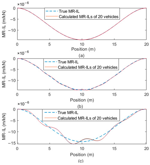 True and calculated fundamental MR-ILs for bridge and vehicle at different speeds: (a) 2 m/s; (b) 10 m/s; (c) 20 m/s.