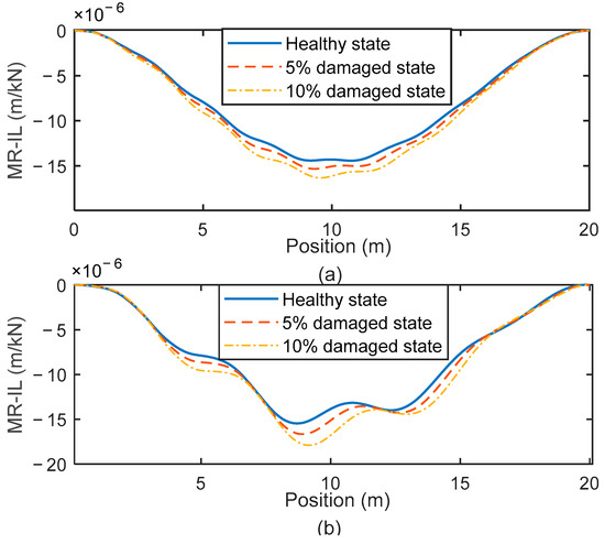 Two bridge states with different levels of global damage are simulated, with the resulting moving reference deflections and MR-ILs. It is acknowledged that the capacity of the bridge is different from its flexural rigidity (stiffness). However, the two are well correlated and changes in flexural rigidity are used here to simulate changes in bridge condition. The overall losses of flexural rigidity are 5% and 10%. Batches of 20 vehicles are generated with the same property values in Table 2 and simulated crossing the bridge in its healthy state and in the two damaged states. Two speeds are used separately: 10 m/s and 20 m/s. The mean calculated MR-ILs of the three bridge states are shown in Figure 8. The mean of the 20 mid-span MR-IL values, denoted , is chosen as an indicator of bridge damage. It is noted that MR-IL is inversely proportional to the flexural rigidity, so it is inversely proportional to damage. For this reason, is defined by Equation (24). The area under the mean calculated MR-ILs (denoted ) is used as .