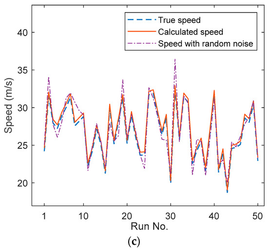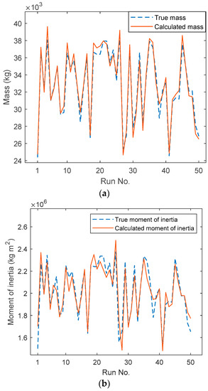 (a). Calculated vehicle masses for each of the 50 runs in the batch, running on Profile 1, State 7. (b). Calculated vehicle moments of inertia for each of the 50 runs in the batch, running on Profile 1, State 7. (c) Calculated vehicle speeds for each of the 50 runs in the batch, running on Profile 1, State 7.