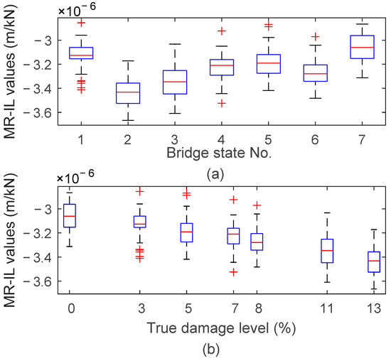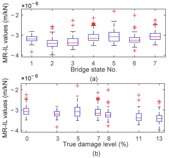The vehicle properties calculated using the off-bridge data are used to find the APs for the section of track on the bridge. For each run, the APs under each of the four wheels are found using the Inverse Newmark-β method from the signals provided by NTNU. The calculated AP of the bridge from one run over Profile 1, State 7, is shown in Figure 11. In this figure, the calculated AP is very close to the true one after shifting. The fundamental MR-IL of the first bogie is calculated from the APs under these two wheels using the method described in Section 5. Figure 12 presents box plots showing the mid-span MR-IL values for Profile 1 and different bridge damage states/damage levels. Each box represents data from 50 mid-span MR-IL values and one bridge state. Here, the State 7 is the healthy bridge and has the smallest MR-IL values. On each box, the central mark indicates the median, and the bottom and top edges of the box indicate the 25th and 75th percentiles, respectively. The whiskers extend to the most extreme data points not considered outliers, and the outliers are plotted individually using the ‘+’ symbol. The box plot shows that the mid-span MR-IL values provide good repeatability, with obvious differences between damage states. The mean of the 50 mid-span MR-IL values and the area under the mean calculated MR-IL is used to calculate the bridge damage indicator defined in Equation (24).
