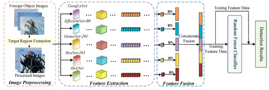 Compared with the complex feature definition, extraction, and screening processes of traditional detection method, CNN is more convenient and effective to extract the features of foreign object images and has higher detection accuracy. To improve the detection accuracy of the foreign objects on transmission lines, the strategy combining multi-network feature fusion and random forest classifier is proposed. The overall implementation process is shown in Figure 2.