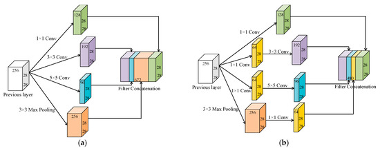 The Inceptionv1 of the GoogLeNet is adopted in this paper which is composed of nine Inception modules. The Inception modules in Inceptionv1 are improved on the basis of the original Inception modules, whose structure is shown in Figure 3b. That is, three 1 × 1 Convs are added to the original Inception modules to reduce the complexity of the model without losing the feature representation ability of the model. With the introduction of these three 1 × 1 reduced-dimensional Convs, the number of parameters and computation of the network is greatly reduced.