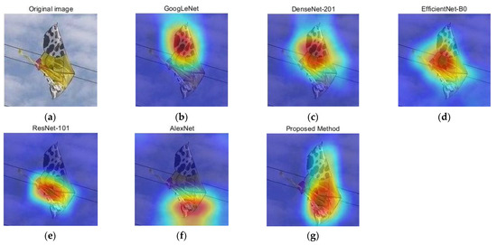 In order to verify the complementarity of features extracted by different networks, the saliency maps of five networks obtained by Grad-CAM were used to visualize the decision regions of each network. Taking an image of a kite hanging on transmission lines as an example, the visualization results are shown in Figure 6, where the deeper color corresponds to the area that the selected network pays more attention to. Different CNN has diverse decision region, it can be seen from Figure 6 that the coverage of the decision region of the proposed method is larger than that of a single convolutional neural network, which means that the extracted features contain more image information.