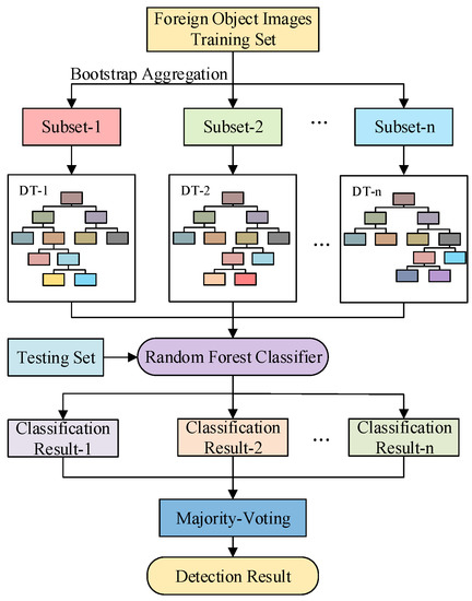 The classification process of the random forest classification model is shown in Figure 7, which can be concluded as the following steps: (1) random forest adopts Bootstrapping re-sampling technology to select samples from the random input training features, which were used to train DTs; (2) these well-trained DTs are combined to form random forest classifier, and each sub-DT will classify the testing samples and give the classification results; (3) the final result is determined by majority voting.