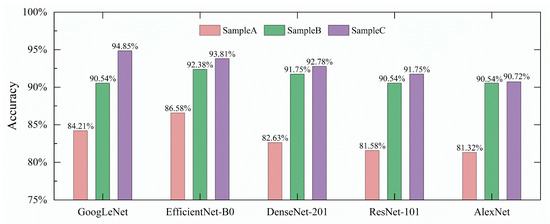 In order to verify the effect of image preprocessing and artificial synthetic images on improving the accuracy, the prepared samples were randomly divided into training set and testing set according to the proportion of 7:3. Then, the divided samples were transformed into the size of 224 × 224 × 3 and input to the selected networks such as GoogLeNet, EfficientNet-B0, DenseNet-201, ResNet-101 and AlexNet for feature extraction and the extracted features were used to train and test the random forest classifier. The detection results of three kinds of samples are compared and analyzed, as shown in Figure 8.