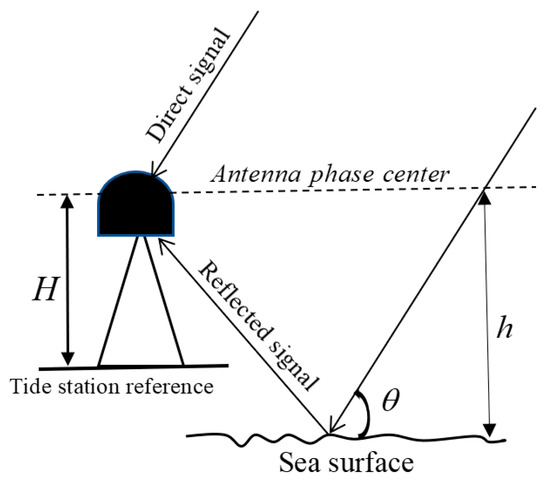 Figure 1 shows the basic model of tide level inversion of the shore-based receiver. In the figure, H represents the height from the antenna phase center to the reflecting surface, also known as the effective inversion height; is the vertical height from the celestial center phase center to the datum of the tide gauge station; and represents the altitude angle of the satellite.