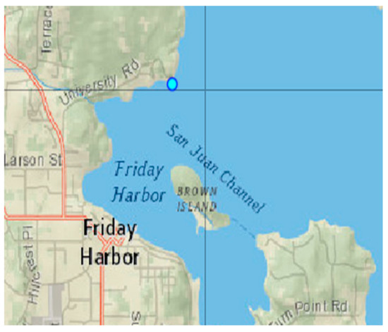 In this paper, the satellite observation data of the sc02 station in Friday Harbor Port, Washington, USA are selected for experimental verification. The sc02 station is subordinate to the plate edge observation PBO network of the “earth scope” of the United States. It is built near the sea and equipped with a Trimble netr9 geodetic receiver. It can accept the sea-surface reflection signal in the sea-surface direction at the direction angle of 45°~220°. The height h of the antenna phase center is 5.389 m. A tide-gauge station is built near the station, which can provide tide level data once every 6 min. Figure 2 shows the surrounding environment of the sc02 station, and Figure 3 shows the geographical location of the sc02 station. It is said that under the influence of the gravitational pull of the moon and the sun, the sea-surface height changes periodically with the occurrence of the sea-surface height, and the sea-surface change period with time is about one month, so when the technology is used to achieve one-month tide level inversion, it can explain the effectiveness of the technology for a long time. Therefore, this paper uses one month’s GPS satellite observation data from Friday Harbor sc02 station from 1 August to 31 August 2020 for the experiments.
