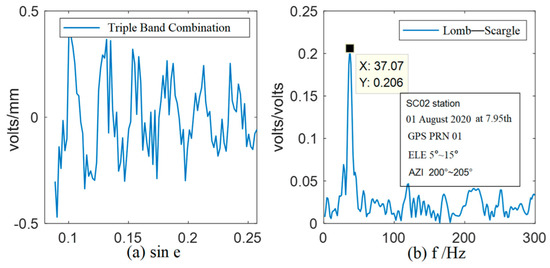 Periodic diagram (a) The triple-frequency combined-phase observation and (b) the Lomb-Scargle spectrum; sin e is the sinusoidal value of the satellite altitude angle e.