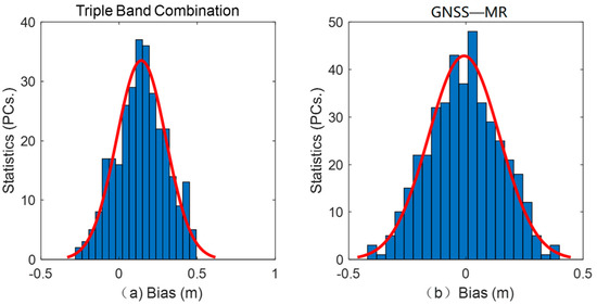 The Figure 8 is the histogram of the statistical distribution of the tidal deviation of two methods, which are the triple-frequency combined inversion of the tide level method (a) and the GNSS-MR inversion (b).