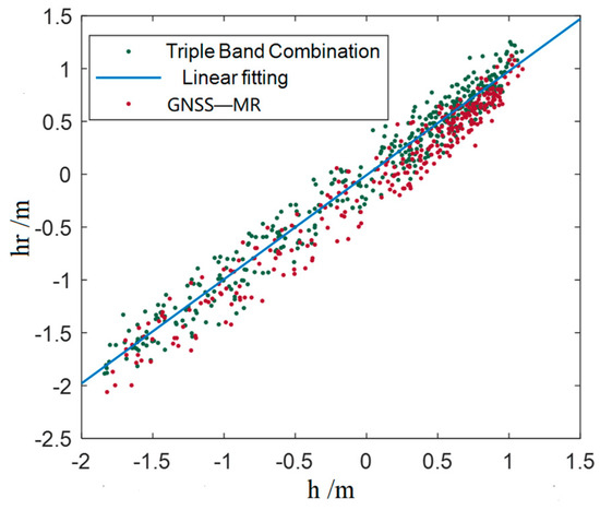 The Figure 9 analyzed the results and obtained the relationship among the height of GNSS-MR tide level inversion method, the height of triple-frequency combined method, and the tide level height. The longitudinal axis hr indicates the tide level height of the inversions; the horizontal axis h indicates the measured tide level height of the tide gauge station in the Figure 9.
