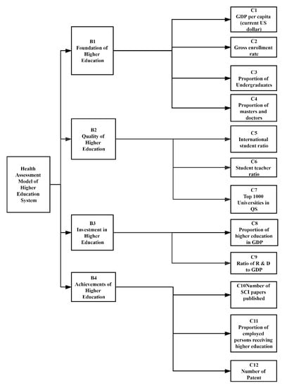 According to the context, input, process, product (CIPP) model proposed by Yong et al. [], we summarize the main contents of the development level of higher education as follows: