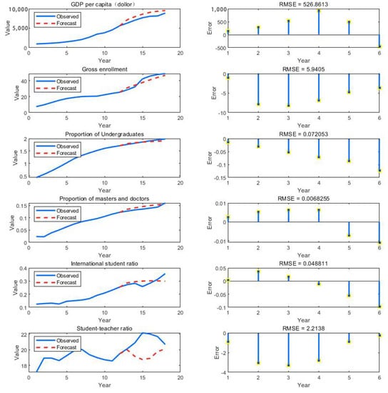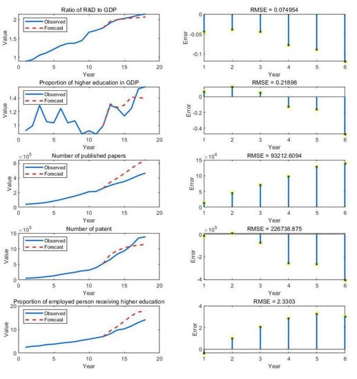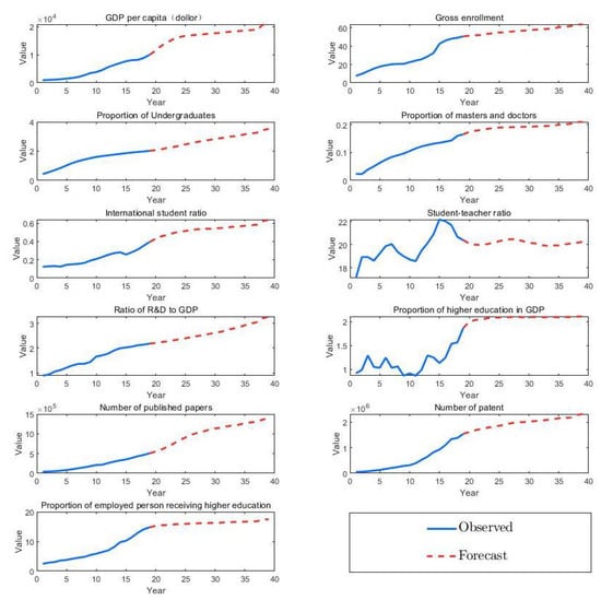 In the training of the LSTM neural network, we divide the dataset into the training dataset and the test dataset according to the ratio of 2:1. Then, we input the test dataset into the trained neural network to output the prediction dataset, and we calculate the RMSE values. The results are illustrated in Figure 12. We see that the predicted values of most indicators in our model are highly consistent with the observed ones, although the predicted curves of some indexes are quite different from the observed ones. For example, the predicted values of the student-teacher ratio are lower than the observed, and the predicted values of the proportions of higher education in GDP decrease and then rise sharply in the observed curve. In addition, the predicted values of the number of published papers and the proportions of employed persons receiving higher education are both obviously higher than their observed.