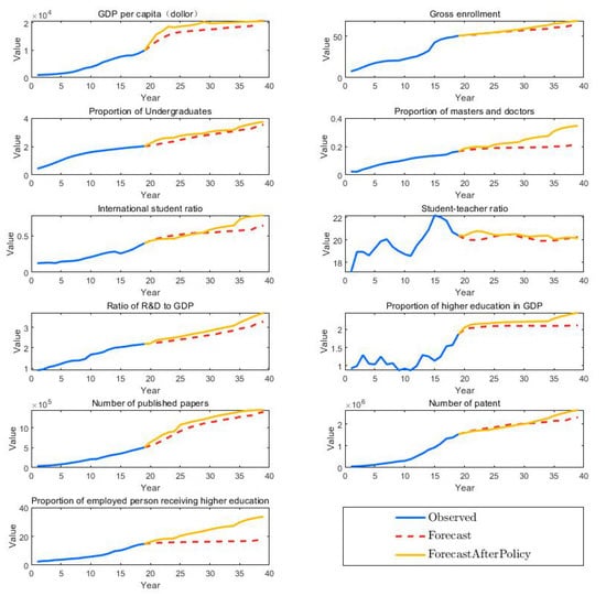 We apply source data to the improved LSTM network and then obtain experimental results shown in Figure 10. We find that under the influence of policies, the predicted values of each indicator exhibit different degrees of improvement relative to those without policy. Firstly, the proportion of masters and doctors and the proportion of employed persons receiving higher education are remarkably elevated by the policies, showing that our policies can significantly improve the popularization rate of higher education. However, economic indicators, including the proportion of higher education expenditures in GDP and the ratio of research and development (R&D) to GDP, present a small improvement. According to official data from the Ministry of Education of China, the proportion of national fiscal expenditures in education to GDP has remained above 4% for nine years (from 2013 to 2021). It can be seen that the predicted results are more in line with the actual trend. In addition, gross enrollment rate and teacher-student ratio are not apparently affected by the policies, indicating that the existing data for these two indicators have stabilized in our prediction model. However, in fact, gross enrollment rate and teacher-student ratio can reflect the richness of national higher education resources, so it is a significant sign of the development of higher education level. According to the experimental results, our policy adjustment seems to ignore this point, so we need to improve in this aspect. In addition, the indicators of scientific research achievements, including number of published papers and patents, show slight improvements. Existing policies can also be adjusted in this aspect. For example, the government can create and publish research journals on its own. However, note that the prediction results are not reasonable at times. For instance, the predicted international student ratio is apparently too high in comparison with the practical ones. According to the scale of the Chinese population, it is obviously unrealistic for the international student ratio to exceed 0.5. This problem brings up a challenge to the rationality of the prediction model. By examining the data of other research objects, we find that this abnormality is not uncommon. One of the possible explanations may be related to inaccurate data sources.