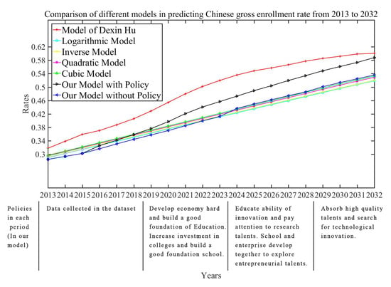 The comparison between the predicted results of the existing model and those of our designed model is shown in Figure 13. Seen from Figure 13, the gross enrollment rates predicted by all models are apparently in rising trends. The predicted values of the four regression models designed by Li et al. [] present little differences, which represent the standard deviations from the concentrated trend, but the average index tends to be the same. In addition, the average annual growth rates of the gross enrollment rates obtained by the models are also very similar. In addition, the predicted values of each model can be verified with one another, which shows that the results obtained by the time series method are consistent. However, the slopes of the four models tend to be constant, indicating that the prediction results tend to be homogeneous and idealized if only relying on the regression equation to fit the predictive line and ignoring the influences of practical factors.