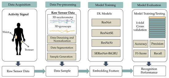 This research investigated S-HARs that are based on DL and use deep residual networks to extract the relevant abstract characteristics from raw sensor data. As seen in Figure 1, the examined S-HAR system comprises four key processes: data collecting, data preprocessing, model training, and model assessment.