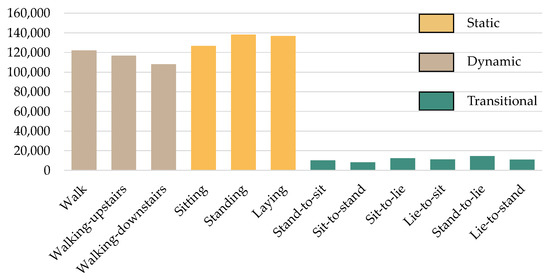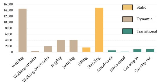 The Biomedical Informatics and eHealth Laboratory (BMI lab) gathered and released the MobiAct dataset [43]. The dataset comprises raw sensor data from a smartphone taken as subjects engaged in various everyday actions and falls. The smartphone was placed in a trouser pocket selected randomly by the individual. We utilize only scenario data in this work to recreate real-world scenarios as suggested in [40]. The scenario data are divided into five sub-scenarios of everyday life: leaving home, being at work, leaving work, exercising, and coming home. The data were gathered from 19 participants as they engaged in 11 distinct activities: 7 fundamental ones (standing, sitting, walking, running, leaping, going downstairs, and walking upwards) and 4 transitions (stand-to-sit, sit-to-stand, car-step in, and car-step out). The source data were acquired using the smartphone’s maximum sampling rate, at around 200 samples per second (Hz). Figure 3 depicts a summary of the MobiAct dataset’s occurrences.