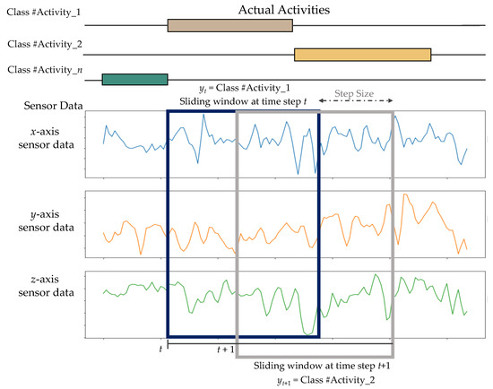 Due to the volume of signal information obtained by wearable sensors, it is impractical to incorporate all of the data into the HAR system at once. As a result, sliding window segmentation should be performed before feeding data into the model. The sliding window approach is widely employed in HAR for the detection of periodic actions (e.g., running, walking) and static actions (e.g., standing, sitting, and lying) [47]. The unprocessed sensor data are divided into fixed-length windows. A fraction of the neighboring windows overlaps to maximize the quantity of training data samples and prevent the loss of the transition from one activity to the next. Figure 4 illustrates the windowing procedure.