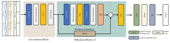 In this study, we proposed the SEResidual block to retrieve hybrid features hierarchically by integrating spatio-temporal and channel-wise data [50]. As seen in Figure 5, this residual block was constructed of Conv1D layers, BN layers, ELU layers, SE components, and a direct connection to BiGRU. The SE modules were included to increase the recommended model’s representational capability in channel attention.
