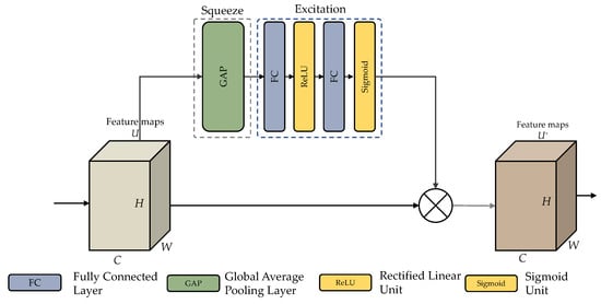 The architecture of an SE module is shown in Figure 7. Following the convolution procedure, many feature maps are obtained. Nevertheless, specific feature maps may include duplicated data. The SE module performs feature recalibration to improve significant features and disable less beneficial ones. This module is divided into two parts: squeeze and excitation stages.