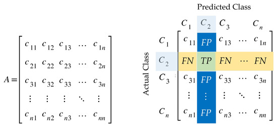 Given a multiclass classification issue using a collection A having n distinct class labels , () represented by . For that situation, the confusion matrix is an matrix, as seen in Figure 8. Each row of the matrix corresponds to an actual instance of a class, whereas each column corresponds to an anticipated instance of a class. At row i and column j, an element of the confusion matrix specifies the number of cases for which the actual class is i and the signified class is j.