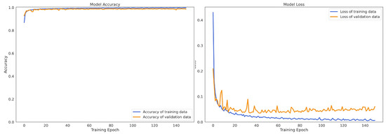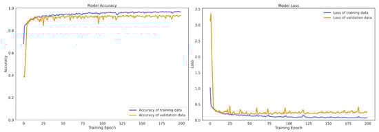 In DL, the settings of hyperparameters are utilized to regulate the learning process. The proposed model makes use of the following hyperparameters: (1) epochs, (2) batch size, (3) learning rate, (4) optimization, and (5) loss function. To establish these hyperparameters, we specified the number of epochs to 200 and the batch size to 128. After 30 epochs, if no progress in the validation loss was seen, we implemented an early stopping call to bring the training process to an end. We began by setting the learning rate to 0.001. After six subsequent epochs, we adjusted it to 75% of its original value if the suggested model validation accuracy did not increase. To reduce error, the Adam optimizer [53] was used with settings = 0.9, = 0.999, and = 1 × 10. The optimizer uses the categorical cross-entropy function to determine the error. Cross-entropy surpasses other approaches, such as classification error and mean squared error [54].