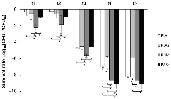 All the strains showed quite a good tolerance in the first two steps of the oro-gastric conditions (lysozyme, pepsin, and progressive pH downshift from 6.5 to 3.0). At steps t1 and t2, RHM survival decreased by 2.2 and 1.8 log units, respectively, while the other strains retained significantly higher viability at these stages. At step t2, which corresponds to the first exposure to gastric conditions with highly acidic pH, PLA and PLA2 showed higher survival than RHM and PAR4. Upon more acidic condition (t3), RHM resistance was again significantly lower compared to the other strains (i.e., 5.6 log reduction of viability for RHM, vs. 4–5 log reduction for the other lactobacilli). Under intestinal-like conditions (t4 and t5), the differences between survivals tended to reduce, although the two L. plantarum strains, and especially PLA2, performed significantly better (i.e., −5.8 and −7.0 log units at t4, −5.9 and −8.2 log units at t5, for PLA2 and PLA, respectively) compared to the other LAB strains.
