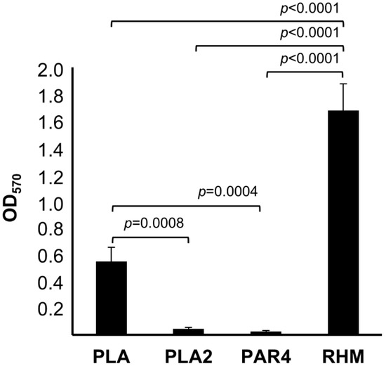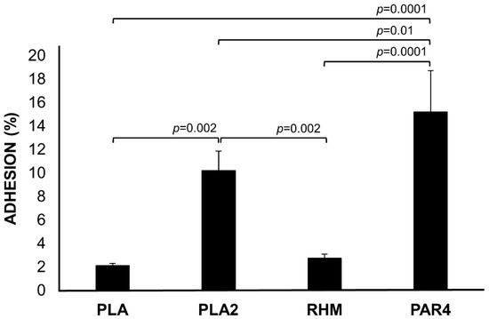Caco-2 monolayer cells were used to test the potential to bind the human intestinal mucosal surface, a valuable probiotic feature. Adhesion abilities differed significantly between the tested lactobacilli. L. rhamnosus PAR4 and L. plantarum PLA2 showed the highest percentage of adhesion (15.2 ± 3.5%, 10.2 ± 1.6%, respectively), while L. plantarum PLA and L. rhamnosus RHM exhibited a lower ability to adhere to Caco-2 (adhesion rates of 2.2 ± 0.1% and 2.7 ± 0.3%, respectively) (Figure 2).