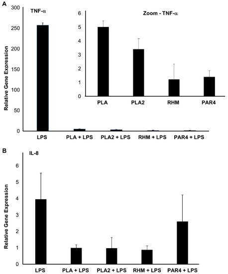 The maximal CSF percentages that corresponded to the highest cell viability (cell viability > 80%) were used to test the capacity of the lactobacilli to influence the expression of genes encoding TNF-α and IL-8, i.e., two cytokines with pro-inflammatory and immune-modulatory function. Quantitative RT-PCR was used to evaluate the transcriptional levels of TNF-α and IL-8 genes in LPS-stimulated human macrophages. Pre-treatment of LPS-stimulated macrophages with 5% CFS (v/v) from L. plantarum PLA and PLA2, and 10% CFS from L. rhamnosus RHM and PAR4 CFS led to a decreased relative expression of genes encoding both the pro-inflammatory cytokines, compared to non-treated LPS-stimulated cells (Figure 4). The anti-inflammatory effect of the tested CFS was particularly evidenced by the consistent repression of TNF-α mRNA level, relative to that observed in LPS-stimulated control (Figure 4A).