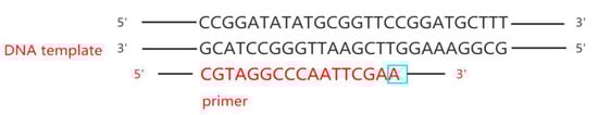 The 3′ end of a primer cannot choose nucleotide “A”, it is better to choose nucleotide “T”. When the 3′ end of a primer is mismatched, the last position is nucleotide “A”, the chain synthesis can be triggered even under mismatched conditions. However, when the last position is nucleotide “T”, mismatch initiation efficiency will be greatly reduced. The initiation efficiency of the nucleotide “G” and nucleotide “C” mismatch is between nucleotide “A” and nucleotide “T”, so nucleotide “T” is the best choice for the 3′ end. See Figure 1.