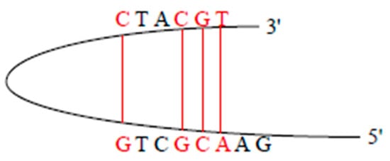 There should also be no complementary sequences between the primer chains. In other words, there should be no complementarity between the forward primer and the reverse primer, and there should not be four consecutive bases of complementarity between the primer chains; in particular, the complementary overlap of the 3′ end should be avoided in order to prevent the formation of a primer double chain (or dimer). The Pc() function was used to indicate whether double chain structures were formed between primer chains, as shown in Formula (10).