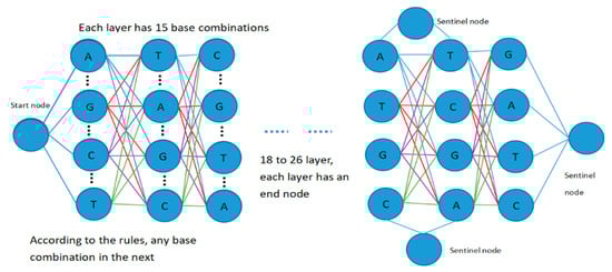 The diagram contains four types of node: start node, intermediate node, sentinel node, and end node. The middle nodes of each layer are successively set as an effective combination of four base pairs, such as nucleotide “A”, “T”, “C”, “G”, “AT”, “AC”, “AG”, “TC”, “TG”, “CG”, “ATC”, “ATG”, “TCG”, “ACG”, “ATCG”, etc. Sentinel nodes are mainly used to separate the forward primer and reverse primer, representing the end of the forward primer and the beginning of the reverse primer.