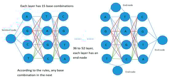 In the process of constructing the search space, each bee constructs a candidate food source from the starting node in Figure 3, and calculates the selection probability of the next optional node in accordance with the probability state transition formula adopted by the next optional node according to its category (i.e., employed bee, onlooker bee, or scout bee). The next node to visit is then selected by means of a roulette game. For each bee, including the intermediate nodes in the next layer, several bases or base combinations that meet the requirements are screened on the basis of the input template DNA sequence and the base matching principle, and then the selection probability of the corresponding nodes is calculated. In this way, nodes are selected layer by layer until an end node is encountered. Therefore, in addition to the above 15 base combinations, an end node is also set at nodes 46 to 54, so that the construction of the candidate food sources can be completed at any time. In this way, each bee completes the construction process of a candidate food that completes the design of a candidate primer pair.