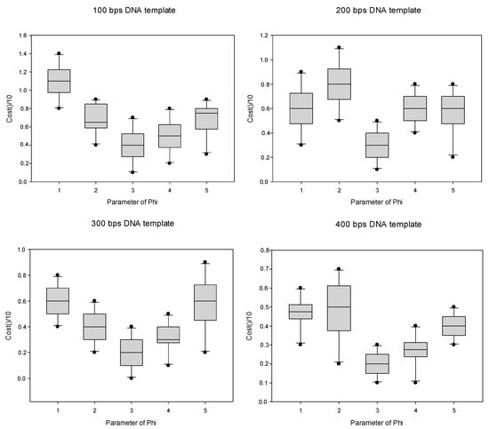 Parameter α represents the corresponding weight of the pheromone factor in the probability state transition formula, which is usually set to 2. Parameter β represents the weight of the corresponding heuristic factor in the formula, and its value is related to the degeneracy and complexity of the primer pairs, and is usually set to 8. Parameter r is the pheromone volatilization coefficient, which is usually set to 0.02. Parameters μ and φ are the key points discussed in this section, representing the corresponding weights of coverage and degeneracy, respectively. By analyzing the number of constraint violations in the process of degenerate primer design, it was found that the value range of parameter μ was between [5, 25], because the number of constraint violations was the lowest within this range; on the other hand, the value range of parameter φ was roughly within [1, 5]. Similarly, because the number of constraint violations was the lowest within this range, the designed primer pair was the best. The values of the above parameters are shown in Table 1.