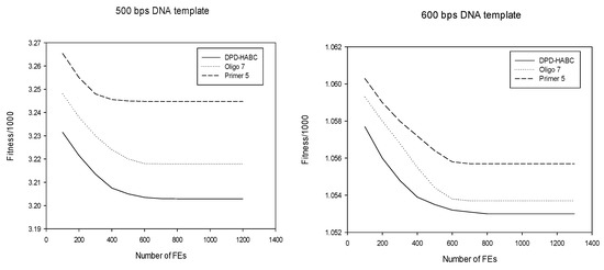 In the convergence curve, the abscissa axis represents the fitness evaluation time, and the ordinate axis represents the value of the fitness evaluation function after standardization over a certain fitness evaluation time. The convergence curve of the DPD-HABC algorithm and the software Primer 5 and Oligo 7 for solving degenerate primer design on 500 bps and 600 bps DNA templates, respectively, is shown in Figure 6.