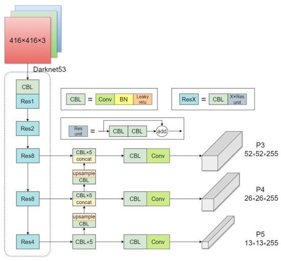 The backbone of YOLOv3 is Darknet53 [36], which downsamples each input image five times, with the last three downsampled layers transmitted to the detection layer for object detection after feature fusion. The structure of the YOLOv3 is shown in Figure 1. For a 416 × 416 input image, the three scales of the detection layers are 13 × 13, 26 × 26, and 52 × 52, which are responsible for detecting objects at different scales. The deep layer contains a large amount of semantic information, while the shallow feature-mapping layer contains a large amount of fine-grained information. Therefore, the network uses a feature pyramid to perform feature fusion, where the downsampled 32-fold feature map is first upsampled to the same size as the downsampled 16-fold feature map, and then, the feature maps are cascaded together. Similarly, the same process is performed for the downsampled 16-fold feature map and the downsampled 8-fold feature map.