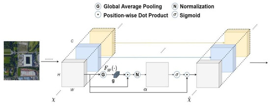 A feature map was obtained from the original image after continuous processing of multiple convolutions, and then, it is divided into several groups along the channel dimension and processed by SGE module. The attention factor of each group of features was obtained and mapped to the corresponding feature map. Finally, after semantic feature enhancement, the feature map was generated. The SGE structure diagram is shown in Figure 3.
