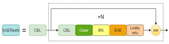 The structure of SGEResN. BN represents batch normalization, and CBL represents conv, BN, and leaky relu.