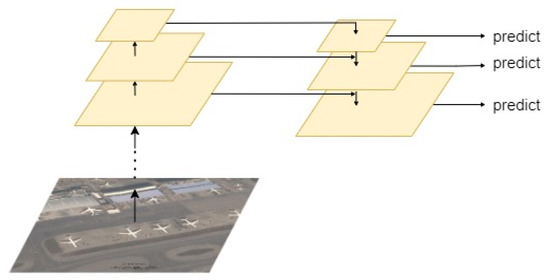 In the feature fusion stage, YOLOv3 uses a feature pyramid network [37] (FPN) to laterally combine the semantic information of the last three feature layers sampled; the feature pyramid network structure is shown in Figure 5.