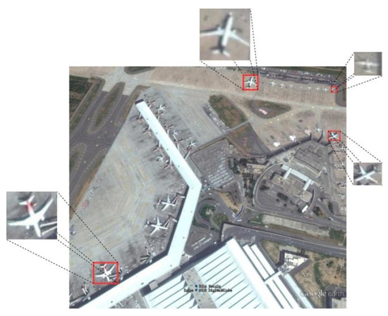 For resolution 416 × 416 input images, with the k-means algorithm, we generated 12 anchor boxes for the four detection layers: (21, 25), (25, 31), (33, 39), (44, 51), (59, 81), (84, 95), (104, 116), (119, 148), (161, 184), (221, 201), (246, 213), and (259 278). The anchor boxes (21, 25), (25, 31), and (33, 39) were designed for the added 104 × 104 detection layer, and they can be used to detect small objects, which are usually only a few pixels in size, in remote sensing images. For medium-sized objects, a slightly larger anchor can be used on a 52 × 52 or 26 × 26 feature map. The anchor boxes (221, 201), (246, 213), and (259 278) were designed for the big objects on 13 × 13 feature map. Therefore, even if an image contains objects of different sizes, as shown in Figure 7, the anchor of hierarchical designed can match the objects.