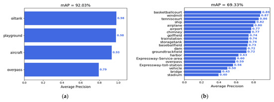 Results of each categories on the RSOD datasets (a) and the DIOR datasets (b).