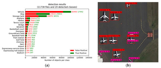 The reason for the high number of false positives is that our model detects some small objects that are not labeled but do exist, such as vehicles and ships. Since we add a detection layer for small objects, our model detects some real objects with lower confidence, which have an impact in the calculation of mAP despite their lower confidence, resulting in a lower final accuracy. Figure 12b shows that although there are many small vehicles, no vehicles are marked in the labeled figure. However, our model detects some of the small cars. Furthermore, there were a small number of training samples for objects such as stadiums, increasing the difficulty of training the model for these objects.